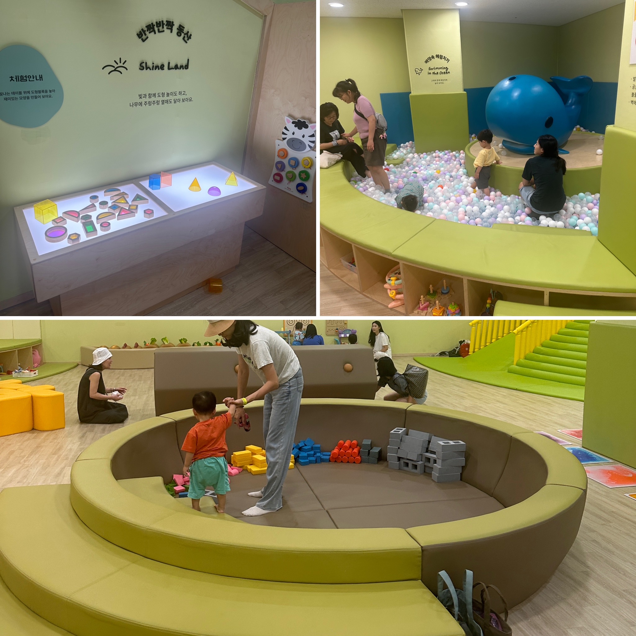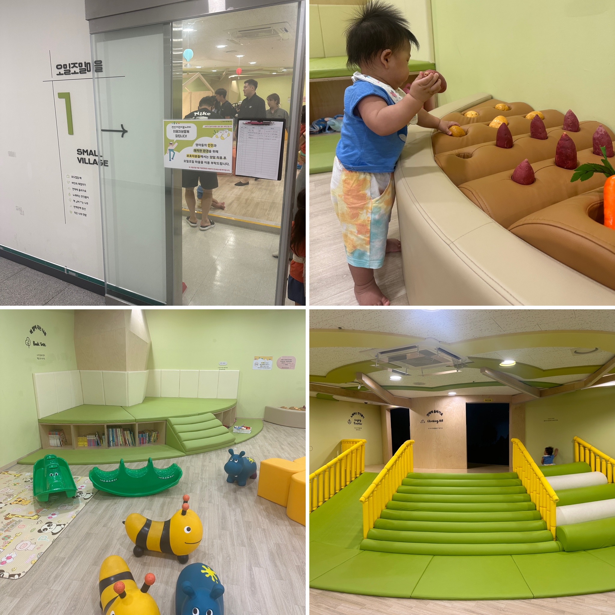 둘째는 오밀조밀마을에서 놀았어요. 0세부터 만2세까지만 입장이 가능해요. 기어다닐 수 있게 마룻바닥이어서 너무 편했어요. 예약제라 한정된 인원만 들어오니 북적이지 않아서 좋더라고요. 그리고 흥놀이터 방문자 대부분 형, 누나들이라 이 곳은 사람이 많지 않아서 더 좋았어요.